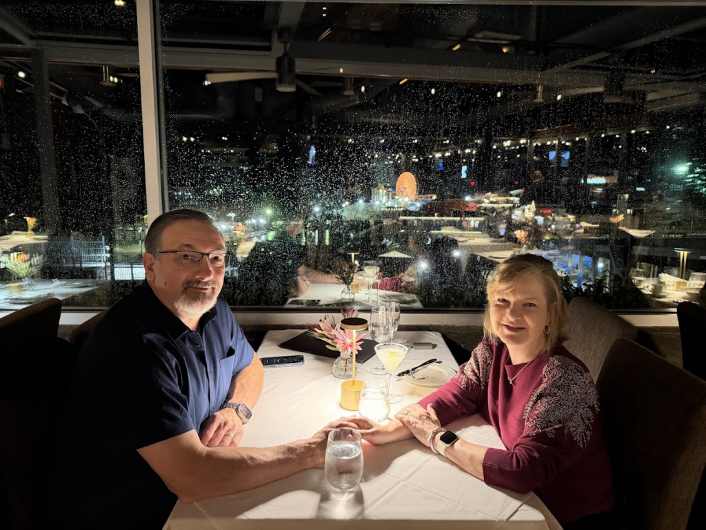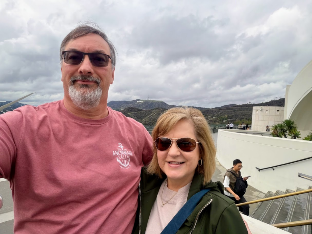 While in LA, Garland booked an “Old Hollywood” tour for my actual birthday. Perfect present for me, being the movie geek I am! Only we would be in LA for the few days it rained constantly – we walked all over Hollywood Blvd in the rain with our tour guide and one other couple. It was very interesting learning about the Dolby Theatre, the Chinese Theatre, the Hollywood Walk of Fame, Musso & Frank’s Grill and much more. Had lunch at 25 Degrees at the Hollywood Roosevelt Hotel – recommendation from our tour guide and it was great. We took Waymos for our “lift” rides since we weren’t sure of parking availability – would you ride in a “driver-less” car? We highly recommend and the price was the same as a traditional ride since you don’t tip the driver. We also liked you get to set your own temperature and music.