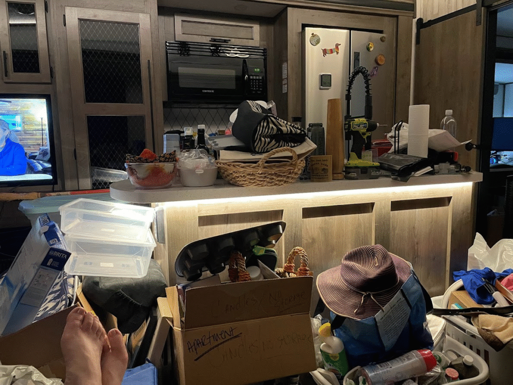 Did I mention it rained again! So, we had more wet/soggy areas in the campground after this – we just couldn’t win with the weather in Yemassee. Really though it rained a TON that month all over the South. And it was much cooler. Cold enough that we turned on our heater in the camper. Can you guess it? The heat wouldn’t come on. G checked the propane to make sure we were not out, but that was not the issue. We still don’t know what’s wrong. This would have been much worse if we didn’t have electric heaters. We’ve learned over the years, use the electricity at your site and space heaters, instead of using up your propane for the furnace. If our camper had a fireplace, that would have been even better. Also on one of our last days, we found a small leak in the bedroom – originating from the roof! You just can’t make this up.